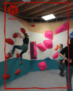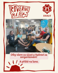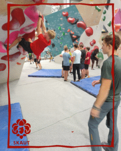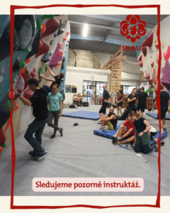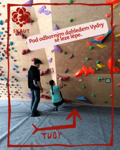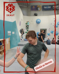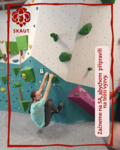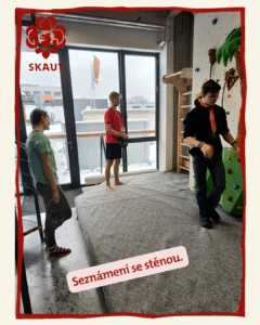 Vydali jsme se na boulder Hangár v Porubě. Abychom nešli do neznámého prostoru, vedl nás tentokrát zkušený lezec Vydra, který si pro nás připravil celou akci. Nejprve jsme společně začali rozcvičkou, kdy si někteří roveři a rangeři vyzkoušeli lezení poprvé, a tak měli spousty otázek jako třeba Jája.