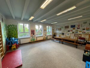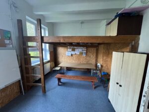 Spí se na zemi na vlastních karimatkách. Do klubovny se přezouvá.