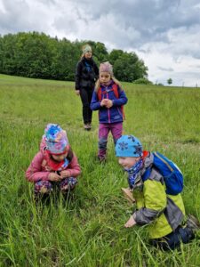 Poté jsme pokračovali přes velké louky, kde jsme našli první jahody, kopretiny a jiné kytičky. V nedalekém lese jsme si dali oběd, postavili domečky z větviček, našli dvě žabky a opět prozkoumali okolí. Pak už byl pomalu čas směřovat naši cestu na autobus do Palkovic.