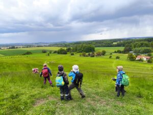 Museli jsme zdolat ještě malý kopeček se zarostlou cestou a pak už jsme se kochali na kopečku krásným výhledem do širokého okolí. Seběhli jsme velký kopec a kolem pole jsme doběhli na zastávku, kde za chvíli už jel autobus.
